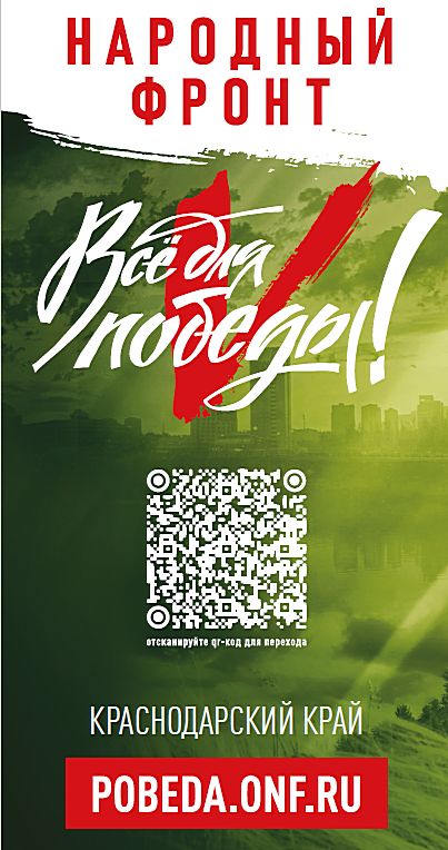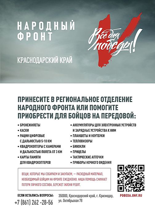 Программа «Народный фронт. Всё для победы» направлена на поддержку российских солдат и офицеров, которые находятся на передовой и выполняют боевые задачи. Фонд собирает пожертвования, на которые закупает и передает дополнительное оборудование и амуницию для армии. Для поддержки участников СВО и мирного населения Общероссийский народный фронт запустил проект «ВСЕ ДЛЯ ПОБЕДЫ». Все собранные средства перечисляются на закупку военного снаряжения, медикаментов, теплых вещей, квадрокоптеров и прочего для военных и добровольцев. В рамках проекта в региональные отделения народного фронта можно принести необходимые для воинских подразделений и мирных жителей вещи, в том числе материально-техническое обеспечение для войск. Оказать поддержку также можно с помощью перевода денежных средств через форму на официальном сайте проекта http://pobeda.onf.ru/, QR коду в информационной карточке. Принять участие в проекте «ВСЕ ДЛЯ ПОБЕДЫ» и оказать целевую благотворительную помощь солдатам и жителям республик, пострадавших от военных действий, может любой желающий. Информацию об участии в проекте можно получить по номеру телефона 8 (800) 200-34-11, по электронному адресу pobeda@onf.ru, а также на официальном сайте http://pobeda.onf.ru/ |