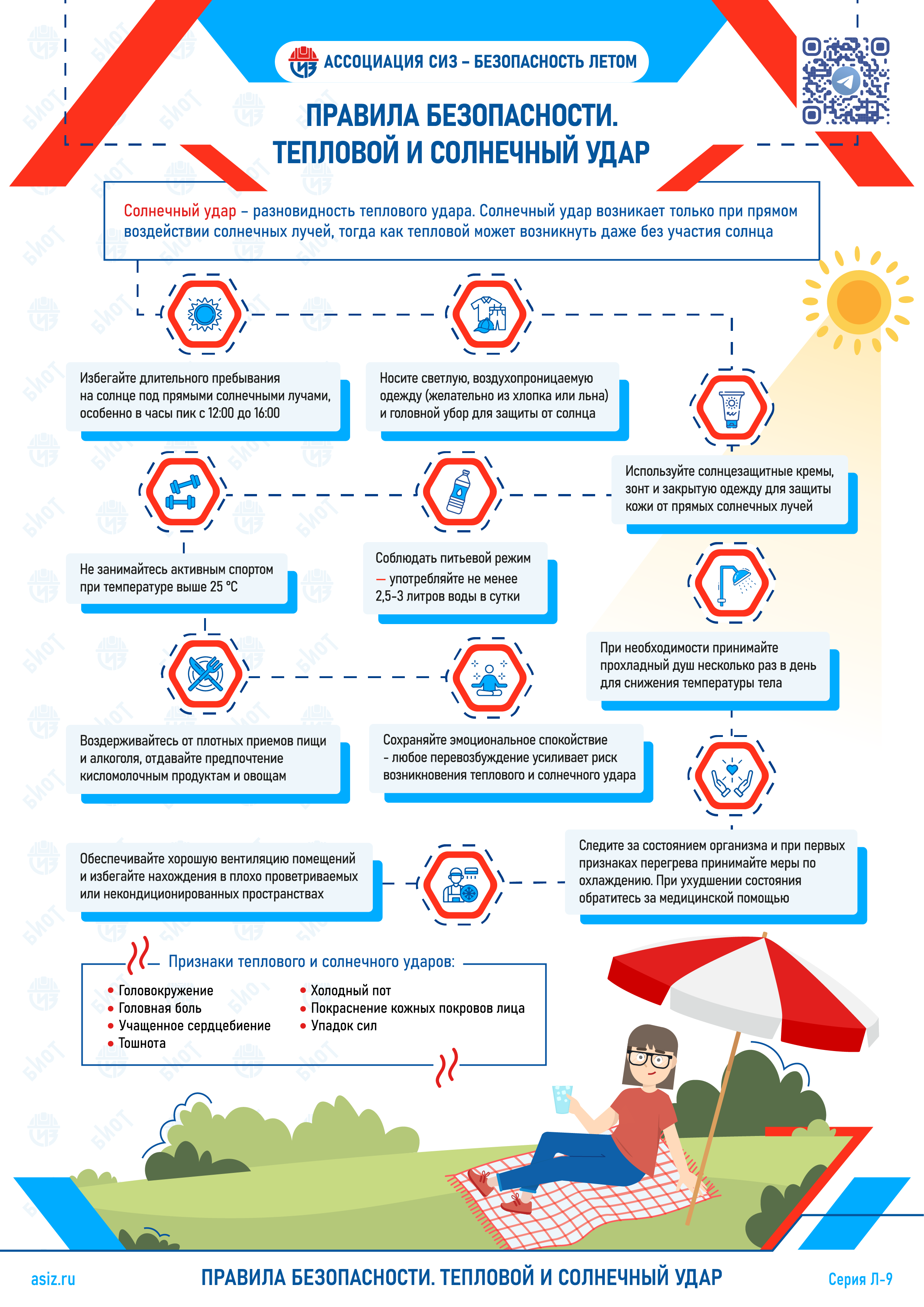 Предлагаем Вашему вниманию советы по обеспечению безопасности и предотвращению теплового и солнечного удара, представленные в инфографике.