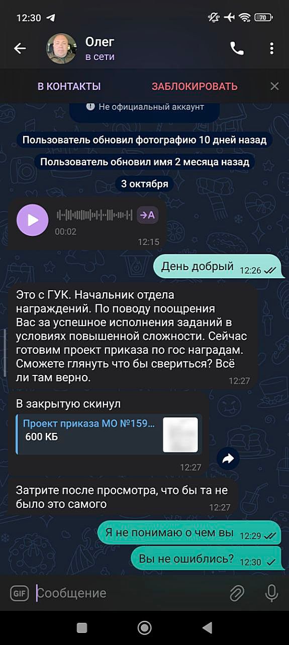 Студентам приходят письма якобы от деканата, госслужащим — сообщения от «аппарата губернатора», а военнослужащим — рассылки от фиктивного «отдела по награждениям». В примере рассылка по соцсетям и мессенджерам в которой злоумышленники, представляясь сотрудниками штабов, рассылают военнослужащим фиктивные приказы о награждении. Под видом «уточнения данных» или «заполнения документов» они пытаются выявить должностных лиц батальонов, полков, бригад и дивизий, а также получить иную информацию. Участие в диалогах с неизвестными в мессенджерах всегда рискованно. Это может привести: к распространению вредоносного программного обеспечения (ВПО); к фишингу — краже паролей, документов и контактов; к сбору персональной и, что опаснее всего, служебной информации. Любая утечка служебных данных может обернуться последствиями не только для отдельного человека, но и для целого подразделения. Использован материал Телеграм-канала «Вестник киберполиции России» Подписаться на Киберполицию России https://t.me/cyberpolice_rus |