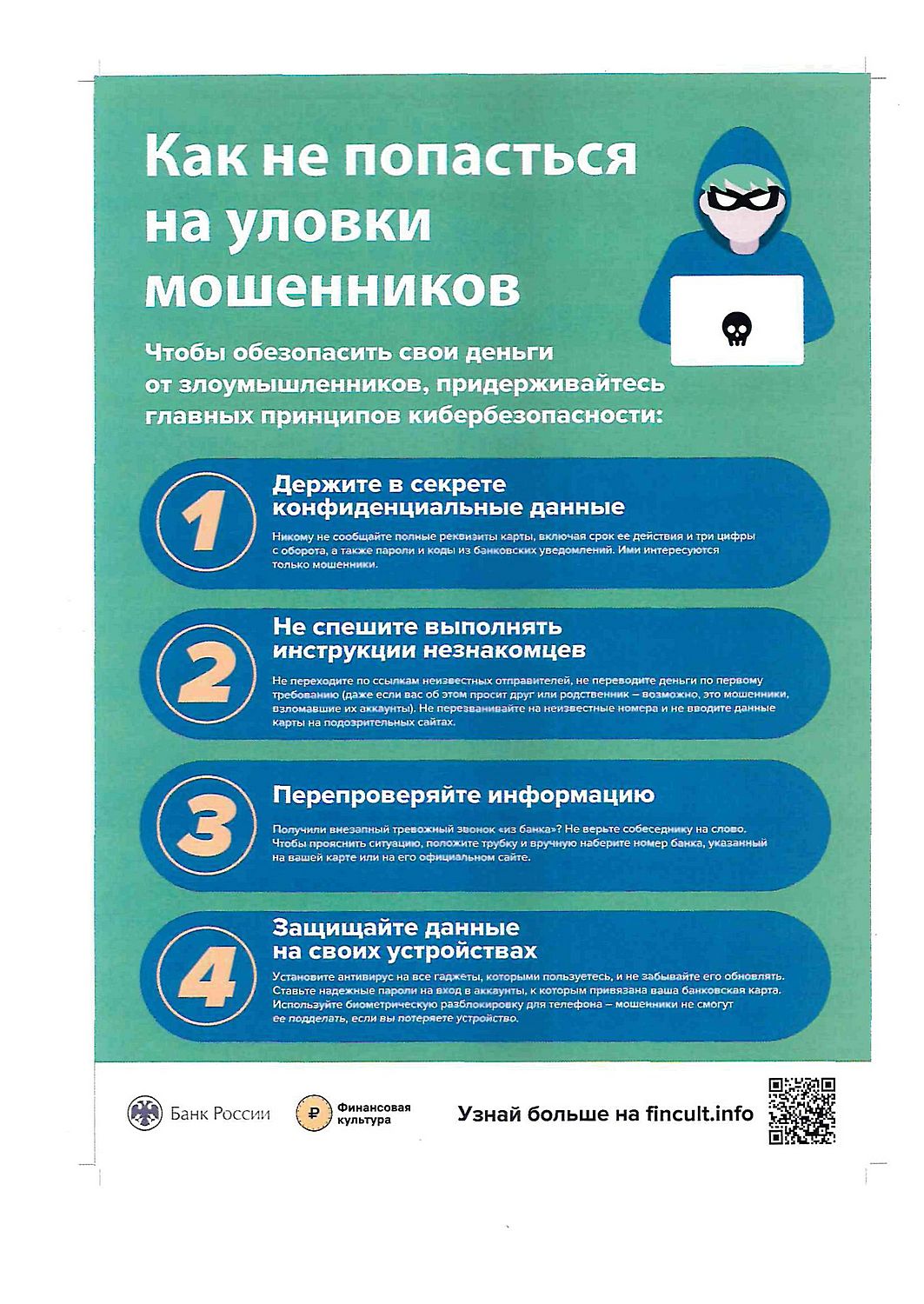 Рассмотрим основные виды мошенничества с использованием IT и способы защиты. Предлагаем изучить информационно-разъяснительные материалы в целях противодействия преступлениям, совершаемым с использованием информационных технологий, разработанные Генеральной прокуратурой Российской Федерации совместно с Банком России.