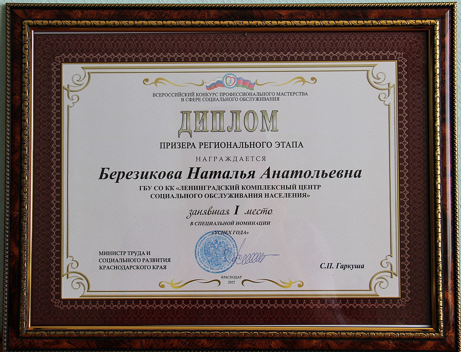 В Краснодарском крае завершился региональный этап Всероссийского конкурса профессионального мастерства в сфере социального обслуживания. Его организатором выступает министерство труда и социальной защиты РФ. Главная цель конкурса – поощрение инициативных руководителей и специалистов, которые внедряют новые подходы в своей работе. Конкурс проходит по 15-ти номинациям. С каждым годом мероприятие набирает все большую популярность среди работников социальной сферы. В 2025 году на региональном этапе свои материалы представили 90 номинантов из учреждений региона. По итогам регионального отбора, обладателем первого места в номинации «Успех года» (лучший руководитель организации социального обслуживания) стала директор Ленинградского комплексного центра социального обслуживания населения Березикова Наталья Анатольевна. Конкурсная комиссия учитывала новизну и уникальность практик, наставническую деятельность, возможность тиражирования практик в других регионах. Всё это есть в учреждении. К тому же идеи и новые программы здесь внедряются постоянно: такова позиция руководителя – совершенствоваться, искать новые формы работы с населением, взаимодействовать с коллегами из подобных организаций, делиться своими наработками со всеми желающими внедрить инновации. Теперь представленный опыт будут рассматривать на федеральном уровне. |