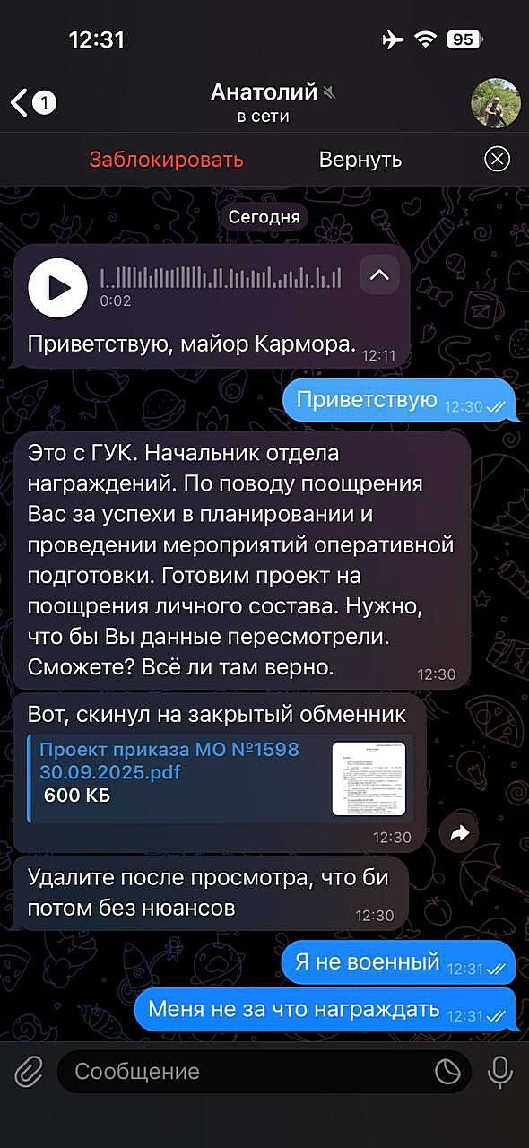 Студентам приходят письма якобы от деканата, госслужащим — сообщения от «аппарата губернатора», а военнослужащим — рассылки от фиктивного «отдела по награждениям». В примере рассылка по соцсетям и мессенджерам в которой злоумышленники, представляясь сотрудниками штабов, рассылают военнослужащим фиктивные приказы о награждении. Под видом «уточнения данных» или «заполнения документов» они пытаются выявить должностных лиц батальонов, полков, бригад и дивизий, а также получить иную информацию. Участие в диалогах с неизвестными в мессенджерах всегда рискованно. Это может привести: к распространению вредоносного программного обеспечения (ВПО); к фишингу — краже паролей, документов и контактов; к сбору персональной и, что опаснее всего, служебной информации. Любая утечка служебных данных может обернуться последствиями не только для отдельного человека, но и для целого подразделения. Использован материал Телеграм-канала «Вестник киберполиции России» Подписаться на Киберполицию России https://t.me/cyberpolice_rus |